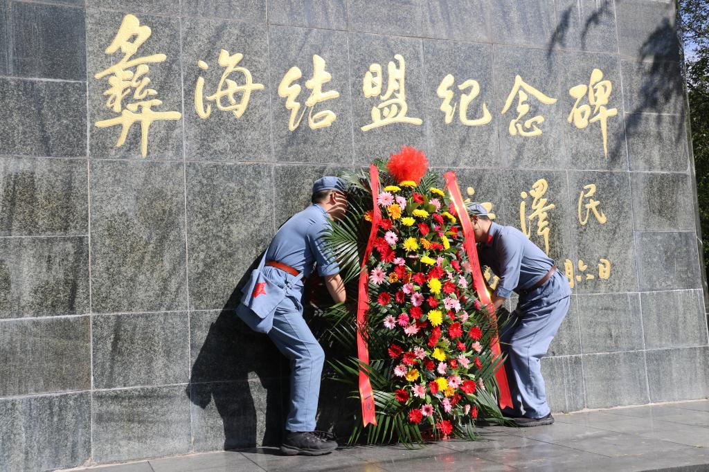在彝海结盟纪念碑前,学员代表向革命英烈敬献花篮。花篮缎带上赫然写着“江山就是人民、人民就是江山”,全体学员在花篮前驻足凝视,表达对结盟历史的隐隐追思的和对革命先烈的深深敬意。