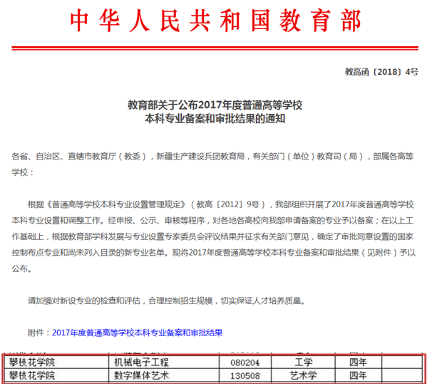 321日,教育部公布了《2017年度普通高等学校本科专业备案和审批结果的通知》(教高函〔20184号),我校申报的机械电子工程学(专业代码:080204)和数字媒体艺术(专业代码:130508)两个本科专业成功获得教育部备案和审批。至此,我校本科专业已达54个,涵盖经济学、法学、文学、理学、工学、农学、医学、管理学、艺术学9大学科门类。