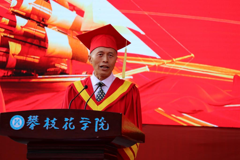 王曙光校长作毕业致辞。他号召全场以最热烈的掌声、最奔放的欢呼声向2022届毕业生表示祝贺,向培养培育我们学生的家长老师致以崇高的敬意,向关心支持我们成长发展的社会各界表示衷心的感谢。他赞美奔跑不停的优秀学子,为每个在建设攀大中奋斗的学子喝彩;与毕业生一同畅想充满期待的未来,回忆在校的青春和美好。