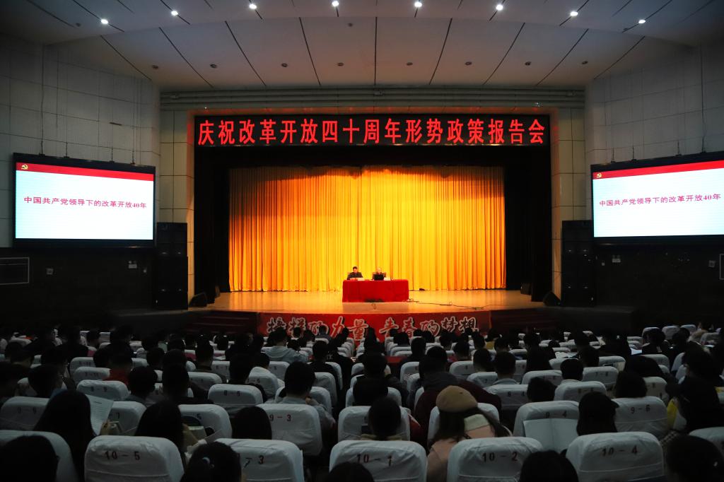 为及时学习、宣传12月18日上午习近平总书记在纪念改革开放四十周年大会上的重要讲话精神,12月18日下午,校党委书记肖立军在会堂为700余名师生代表做题为“中国共产党领导下的改革开放40年”形势与政策报告会。