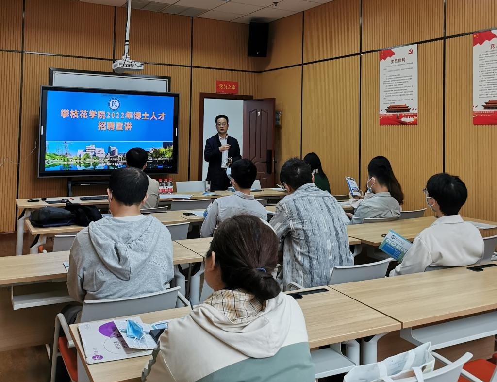 王斌一行在重庆大学举行了招聘博士宣讲会。王斌现场为博士生们介绍了攀枝花市人文地理环境、学校基本情况、拟招聘的岗位、学校自律文化品牌以及硕士学位授权点建设规划等内容。10余名博士研究生到场聆听,并就其关心的薪资待遇、事业平台、服务保障、职业发展方向和路径等问题进行了详细咨询。