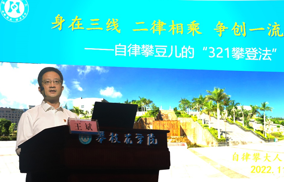 11月9日下午,党委书记王斌以“身在三线 二律相乘 争创一流——自律攀豆儿的‘321攀登法’”为题,为2022级全体新生作专题辅导,引领学生自律自强、成长成才。