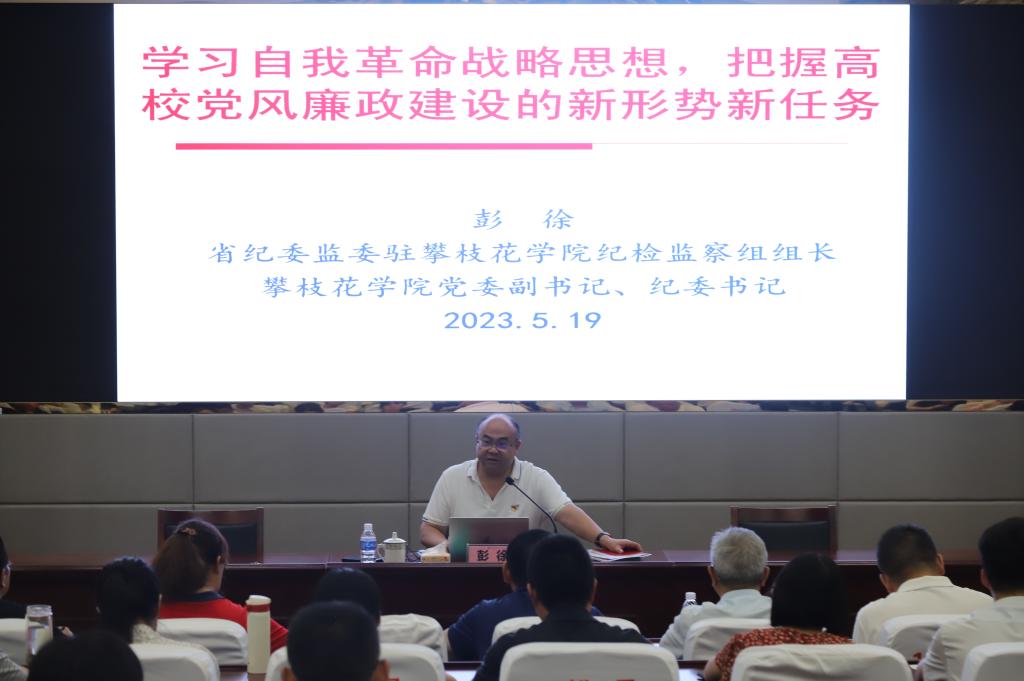 彭徐通过解读2018-2022年十大反腐热词、剖析多名领导干部违纪违法案例等方式, 深入分析了全面从严治党的当前任务和形势,详细解读了四川高校纪检监察工作新形势和新任务,希望纪检监察干部和师生党员把学习贯彻习近平新时代中国特色社会主义思想、党的二十大精神和习近平总书记关于全面从严治党的系列重要讲话精神、关于党风廉政建设和反腐败斗争理论创新结合起来,学思践悟,推动工作。