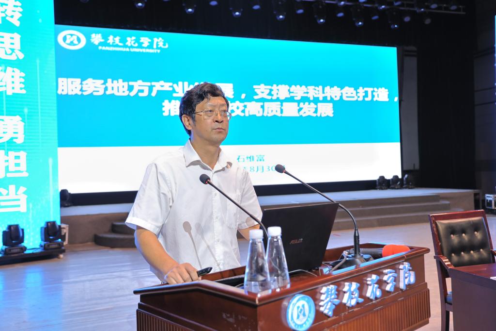 副校长石维富重点围绕科研工作,以“服务地方产业发展,支撑学科特色打造,推动学校高质量发展”为题作专题发言。他深入解读了党的二十大报告关于教育、科技、人才的重要论述,有力阐释了科技自立自强的重要性。通过翔实的数据全面总结分析了学校科研工作取得的成绩和面临的挑战。他指出,要准确把握科技工作重要地位,加快角色定位转变,推动学校科技工作上新台阶;要精准把握全省高校科技工作,系统分析科技工作差距,全面剖析存在问题;要着力强化学科基本条件建设,凝练我校学科特色优势,夯实硕士学位点申报与评估基础;要不断深化有组织科研,打造学校科研特色,推动学校高质量发展。