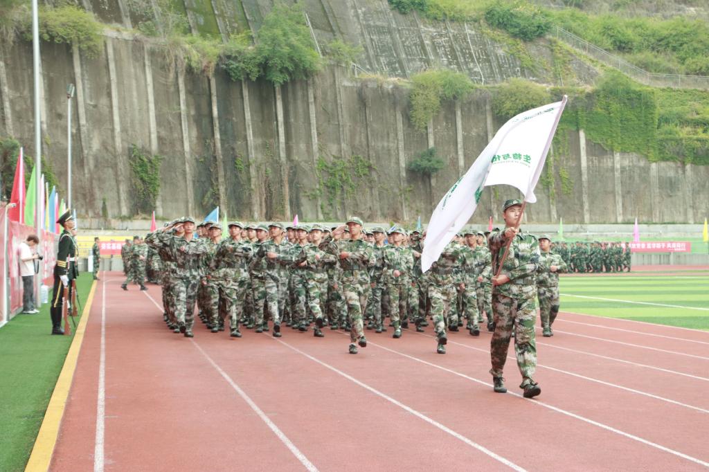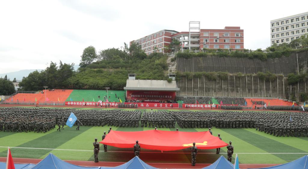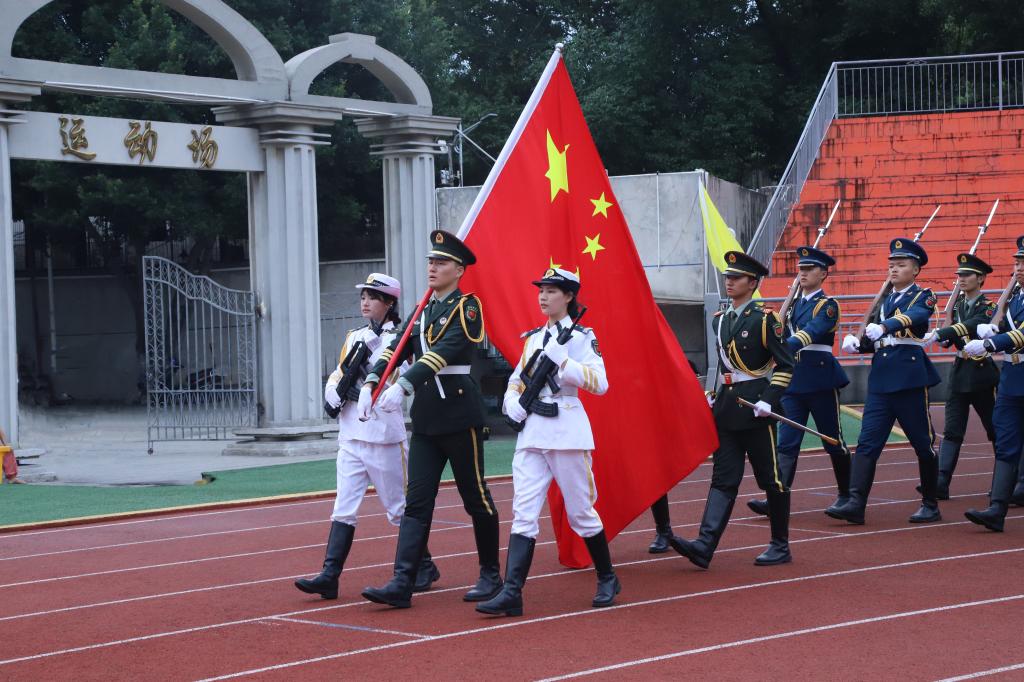 肃穆庄严的国歌奏响,大会正式拉开帷幕。由新生组成的国旗护卫队托举着鲜红的五星红旗,在全校师生的注目礼中冉冉升起。
