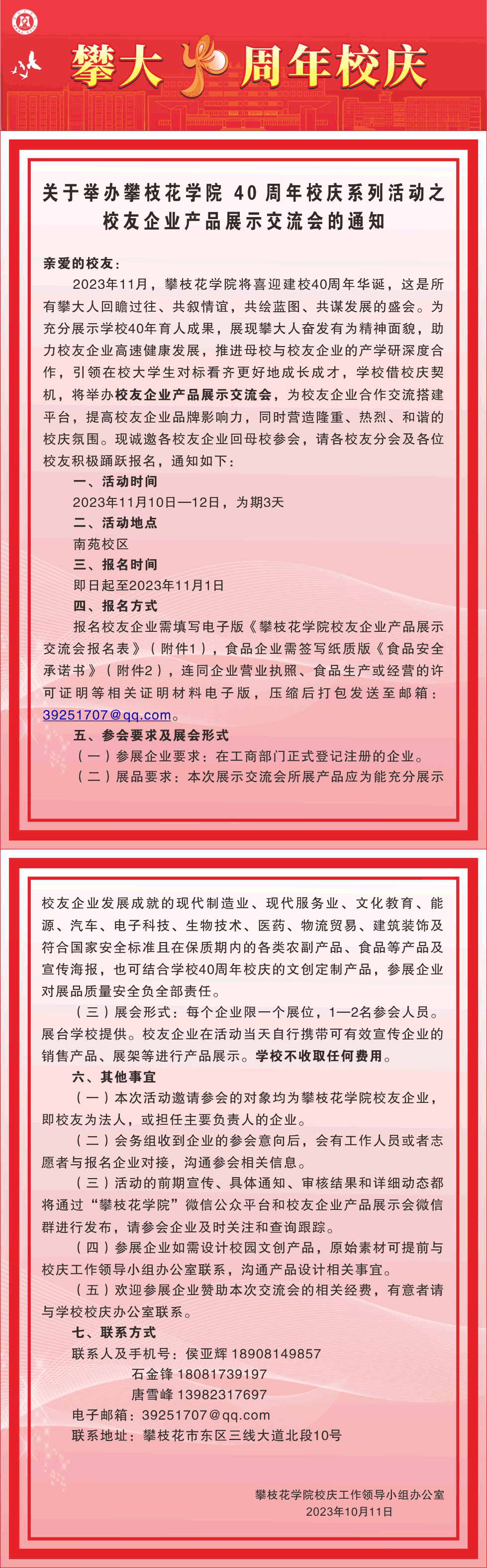 关于举办攀枝花学院40周年校庆系列活动之校友企业产品展示交流会的通知