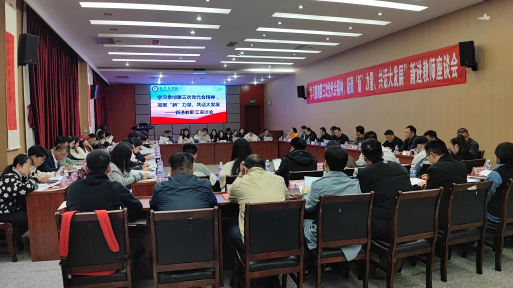 12月13日下午,学校在行政办公楼416室举行“学习贯彻第三次党代会精神,凝聚‘新’力量、共话大发展”——新进教职工座谈会,党委书记胥刚,党委副书记、校长王曙光,党委副书记刘立新,副校长石维富,教工部(人事处)、组织部、学工部(学生处)、教务处、科研处、后管处、工会等部门负责人,在校教师代表以及近两年新进教职工共计68人参加座谈会。会议由副校长张旭辉主持。