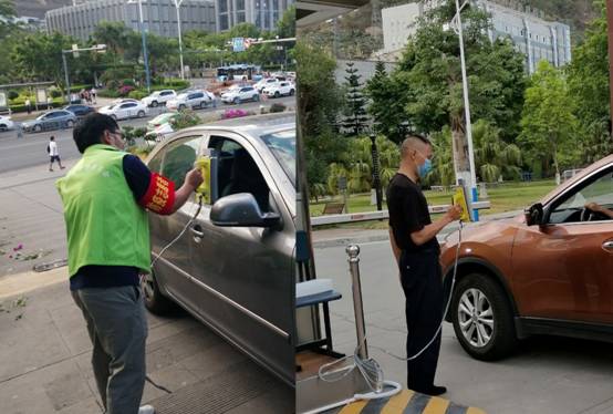 志愿者和工作人员对进校车辆驾乘人员进行检测