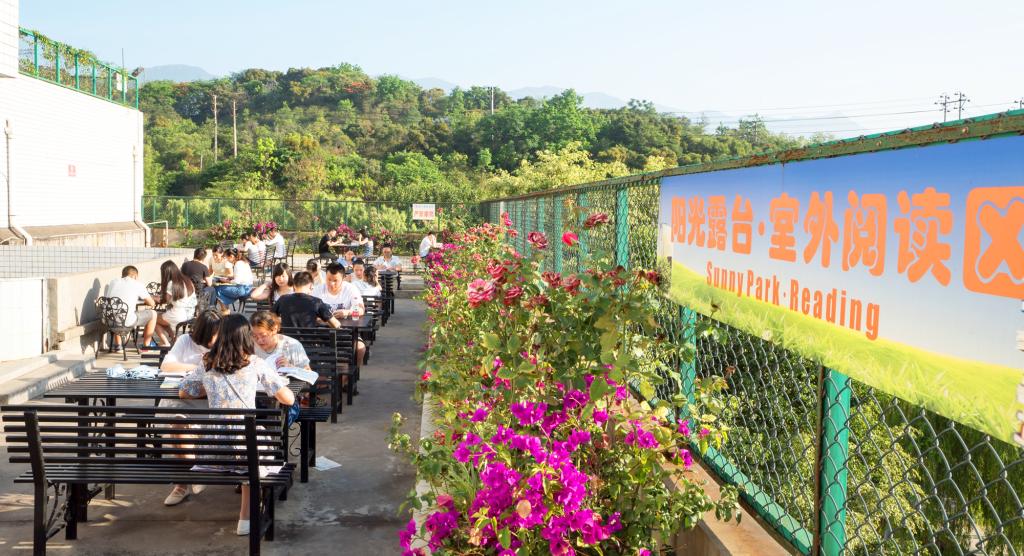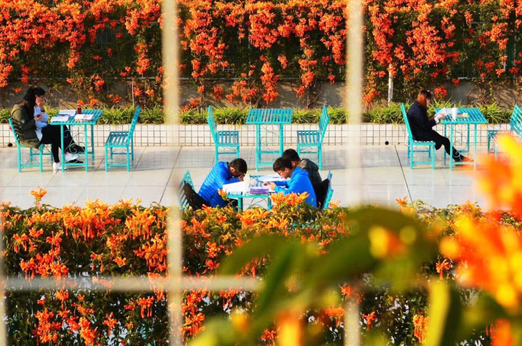 在区域布局上,阳光室外阅读区强调花园的错落有致、特色各异。其中,一楼阅读区的中庭阅读区主要栽种桂花、夜来香和茉莉花等,清风苑主要栽种了青竹和苏铁,有桂花园阅读区和清风苑阅读区;三楼阅读区主要栽种三角梅、茉莉花等,有三角梅园阅读区和茉莉花园阅读区;四楼阅读区主要栽种月季花、栀子花等,有月季花园阅读区和栀子花园阅读区;六楼阅读区主要栽种炮仗花、藤蔓、鸡冠花、吊兰等,有炮仗花园阅读区和鸡冠花园阅读区;七楼阅读区主要以栽种藤蔓、欧洲月季、炮仗花、三叶草等,有炮仗花园阅读区、绿园阅读区。一排排书架、一册册图书,透露着满满的文化气息。花有四季,陪伴同学们的除了书籍,还有各色鲜花。