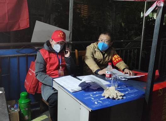 安昀(右)在龙箐花园小区服务点值守