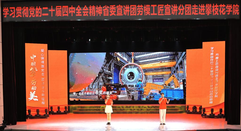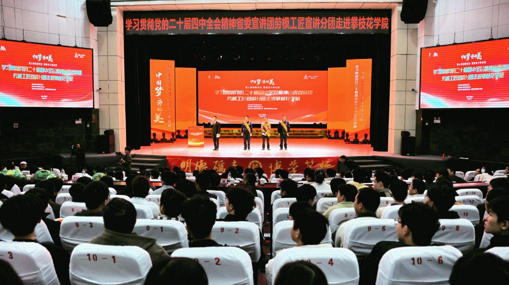 11月20日上午,学习贯彻党的二十届四中全会精神省委宣讲团劳模工匠宣讲分团首场主题宣讲活动在我校圆满举行,攀枝花市总工会党组成员、副主席周健,校党委副书记刘立新出席活动,校工会、马克思主义学院、学工部相关负责人参加活动。活动将党的二十届四中全会精神与劳模工匠的奋斗故事深度融合,三位来自一线的劳模工匠以奋斗故事为载体,将全会精神融入生动宣讲,为近千名师生送上了一堂别开生面的“成长思政课”。