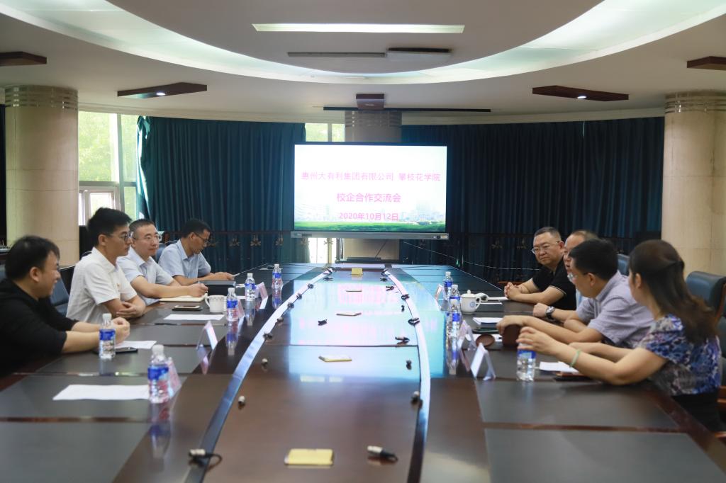 10月12日上午,我校与惠州大有利集团有限公司在办公楼三楼会议室举行校企合作交流会。惠州大有利集团有限公司总经理杜伟良、校党委书记肖立军出席会议,办公室、康养学院、基础医学院相关负责人参会。会议由副校长刘立新主持。