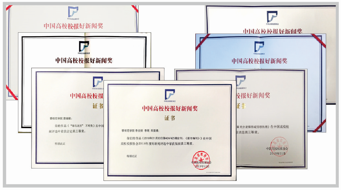 融合多种宣传阵地资源、聚合传播效能明显。各类宣传走心走实,主流思想舆论不断壮大。2018年以来,校园网发布信息1600多条,微信公众号发布微文1300多条,官方微博发布博文4500多条,《攀枝花学院报》发行41期。创新开展的扎根边疆、扎根民企、参军报国校友大型采访宣传系列活动,通过校内报纸、网络、微信、微博以及校外相关媒体同时聚合传播,引起社会广泛关注和强烈反响。举办了师生乐于参与音频、视频、微文设计、摄影作品等校园优秀作品征集评选活动,对优秀网络文化成果进行宣传和展示,师生网络文化素养有力彰显。近年来,学校校报的办报质量显著提升,十余篇作品获得中国高校校报协会优秀作品奖。官方微信开通后发展迅速并取得较好效果,深受师生欢迎,平均阅读、点赞量持续提升,平台作品、创新案例等先后获得市级奖、国内高校创新奖等多个奖项。视听作品参与省大学生艺术展演获得三等奖。近三年在国家媒体上发布外宣信息200余篇次,在师生之中和社会上引起强烈反响。实现传统媒体、新媒体优势互补和加强融合,校内媒体、校外媒体密切协作聚合效能凸显。