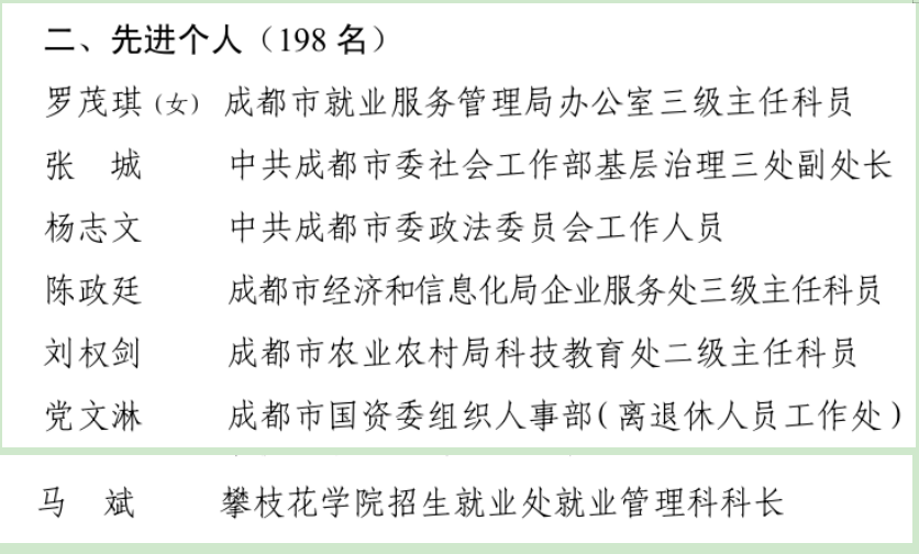 近日,四川省就业促进和劳动保护工作领导小组办公室、人力资源和社会保障厅联合发布《关于表彰四川省就业促进工作先进集体和先进个人的决定》,对全省100个先进集体和198名先进个人予以表彰。我校招就处就业管理科科长马斌同志荣获“四川省就业促进工作先进个人”称号。此项荣誉是对我校就业工作的充分肯定,也是对马斌同志长期扎根就业工作一线,服务毕业生成长成才的充分认可。